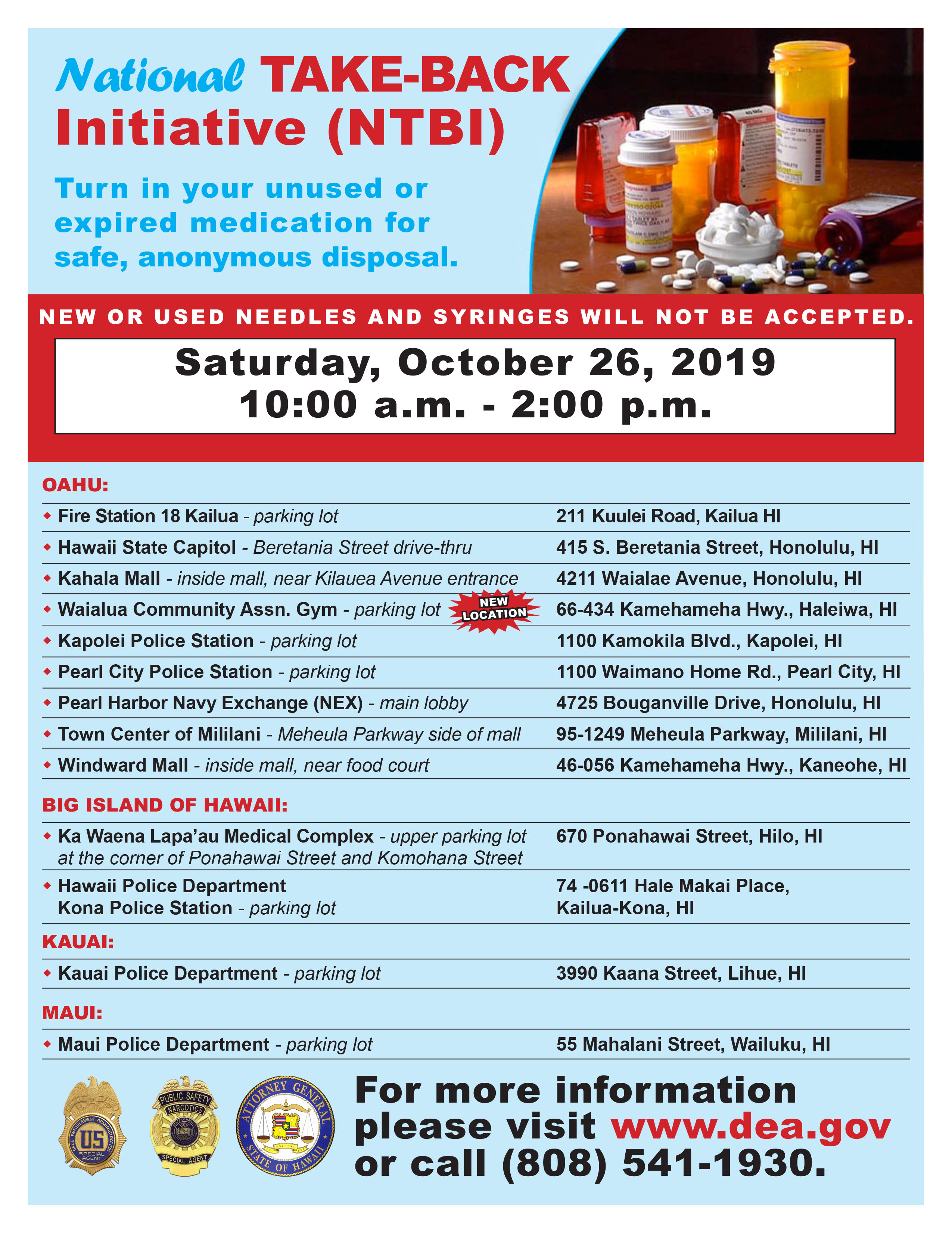National Takeback Initiative (NTBI) – Saturday, October 26, 10:00 AM – 2:00 PM Please refer your patients to turn in their unused or expired medication at Ka Waena Lapa ‘au Medical Complex (upper parking lot at the corner of Ponahawai Street and Komohana Street). Other locations listed in the flyer attached.